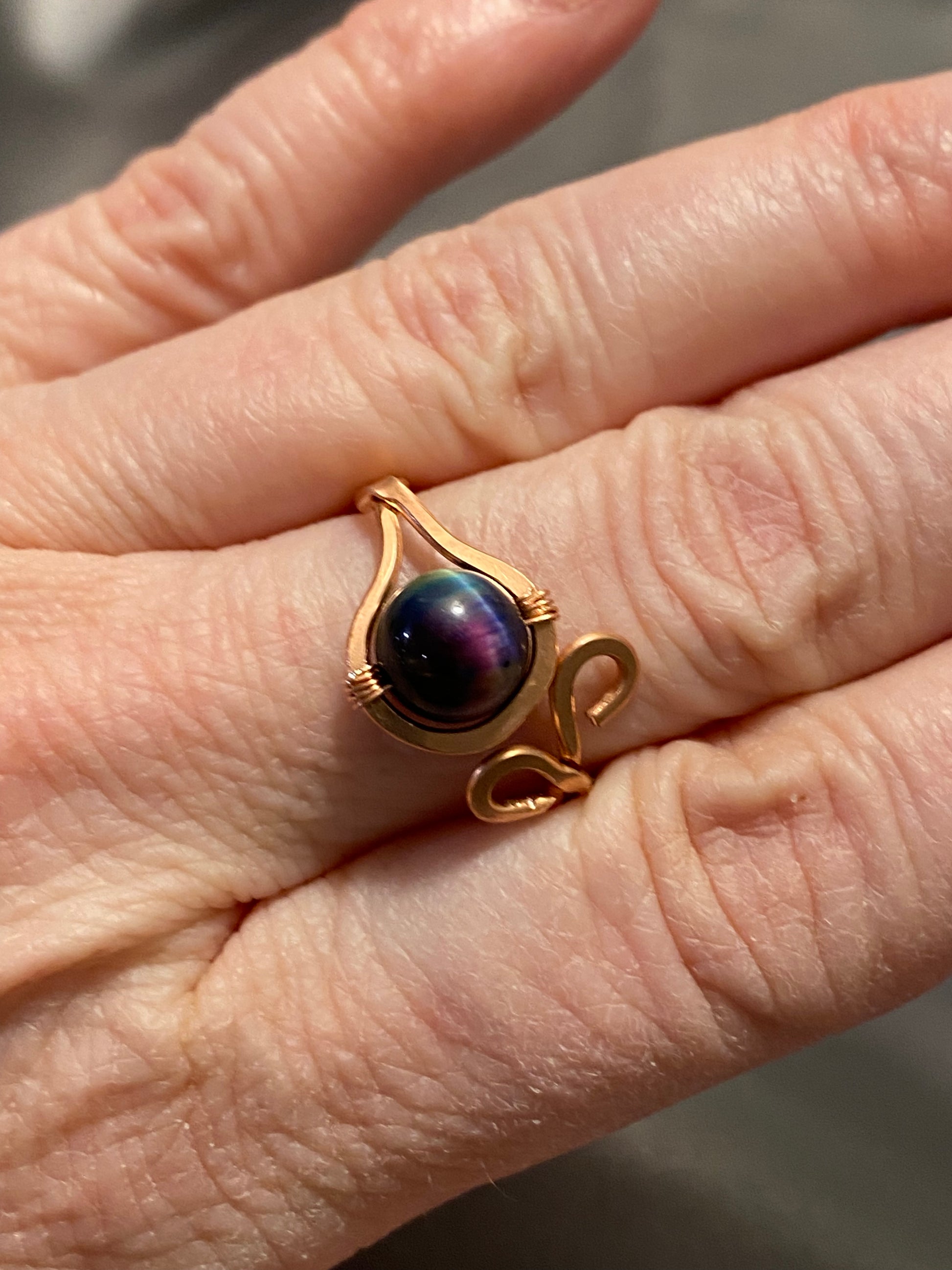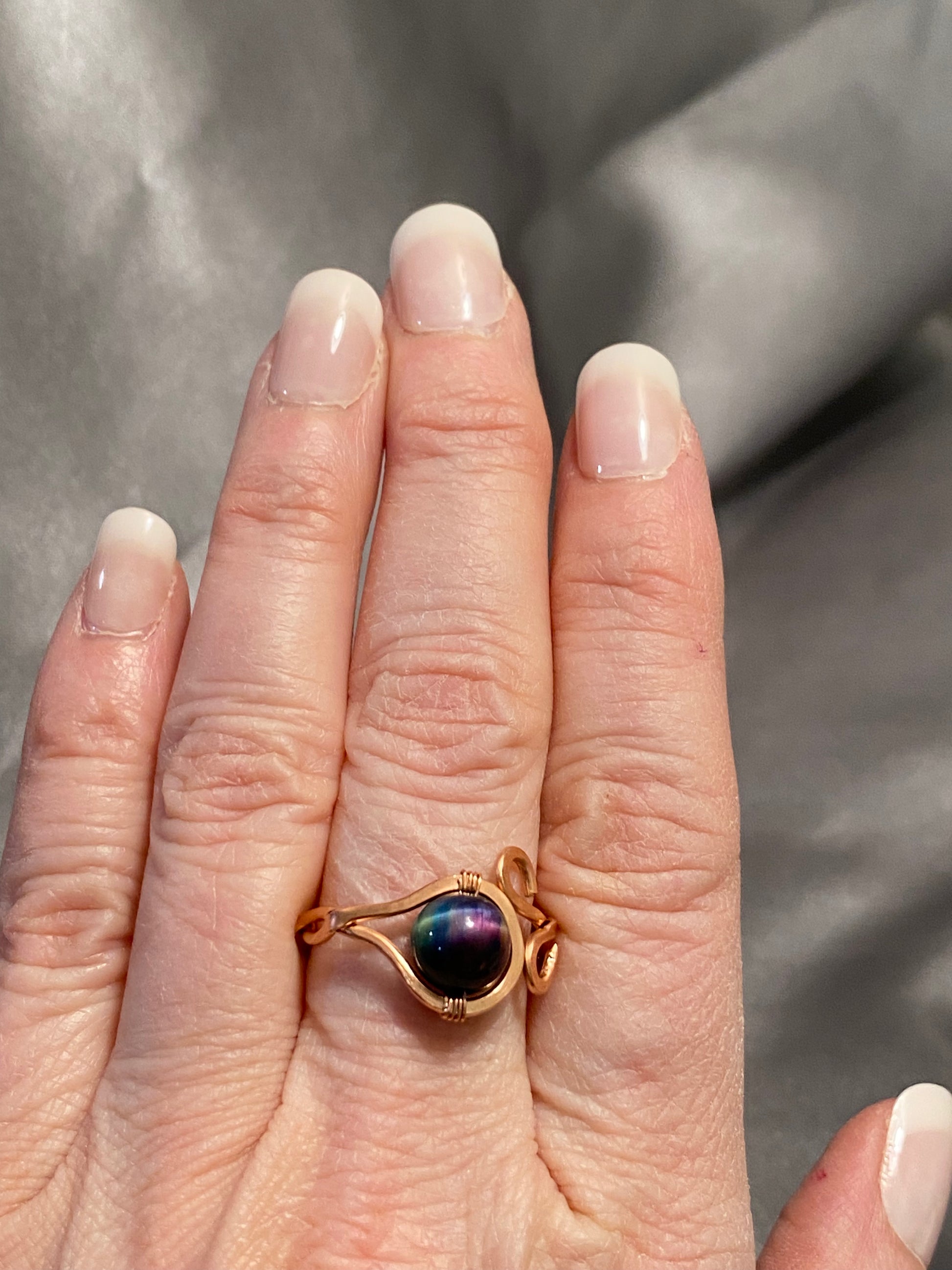 This adjustable twisted bare copper ring has an Aurora Cats Eye Bead that flashes teal, purple, & blue. It's a one-of-a-kind piece that will fit ring sizes 6+. If you like the loo but not the bead, please reach out and I can make to order.