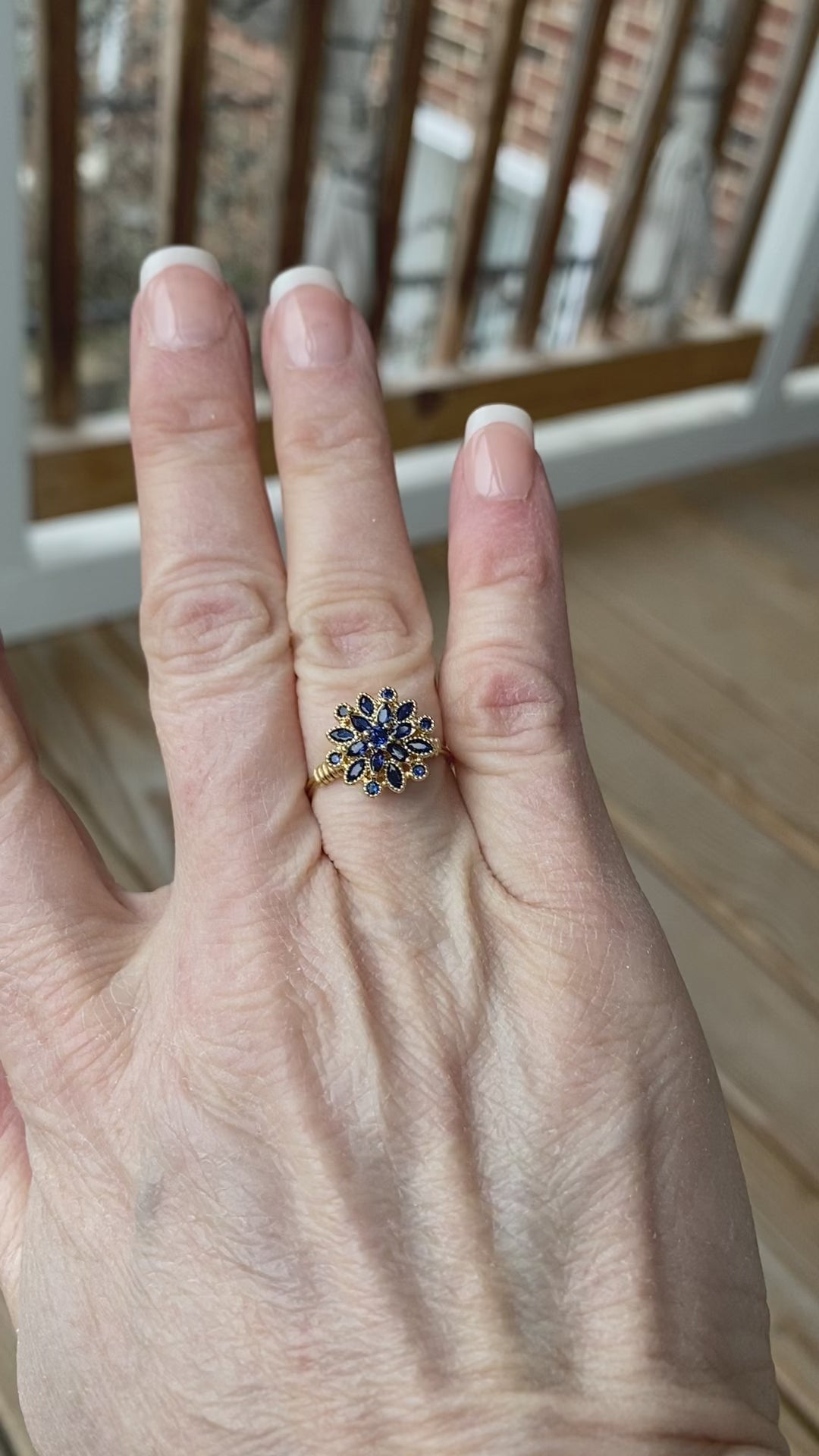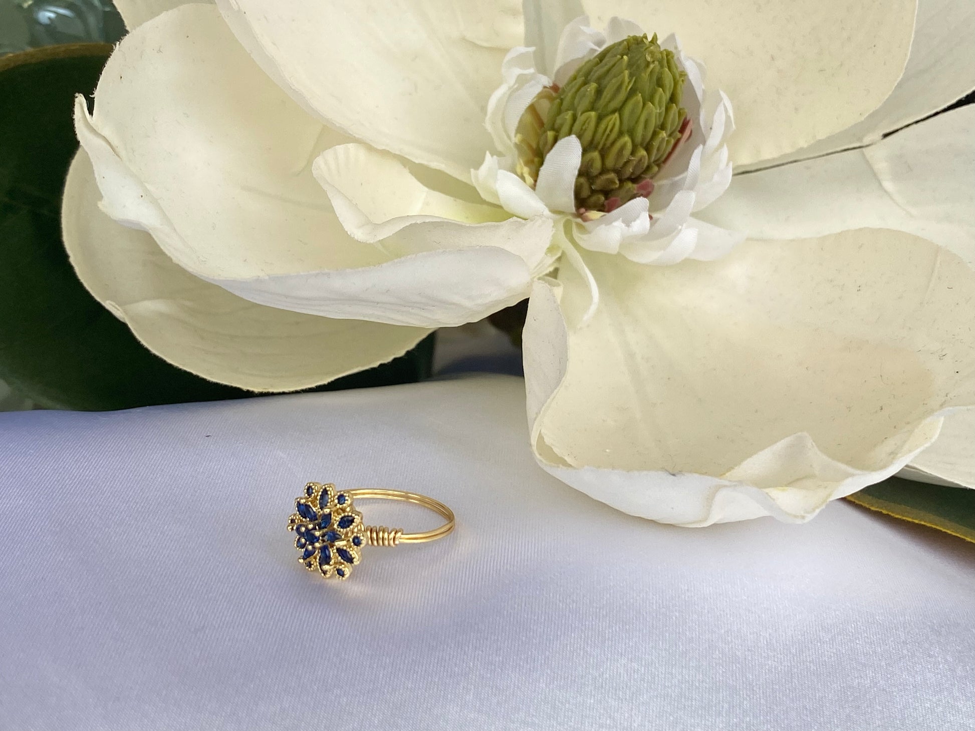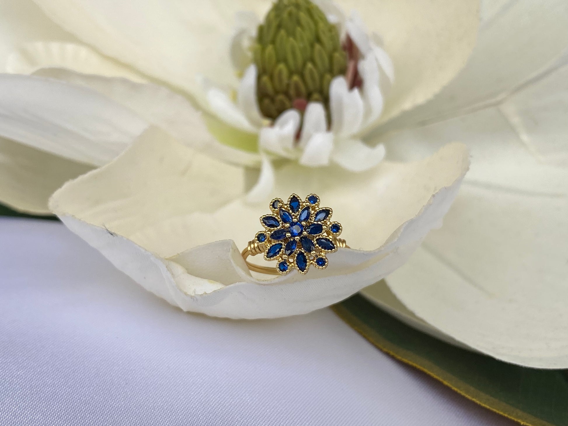 Blue Crystal Flower Button Ring- Gold wire-Size 6.25