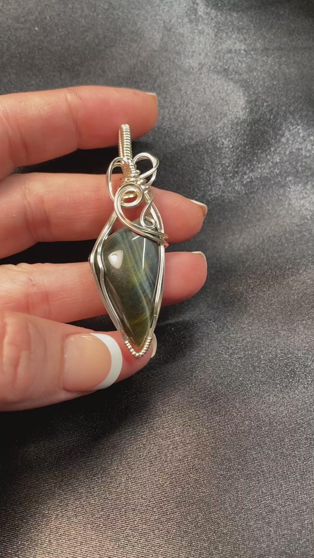 Triangular Blue Tiger Eye pendant wrapped in silver wire.
