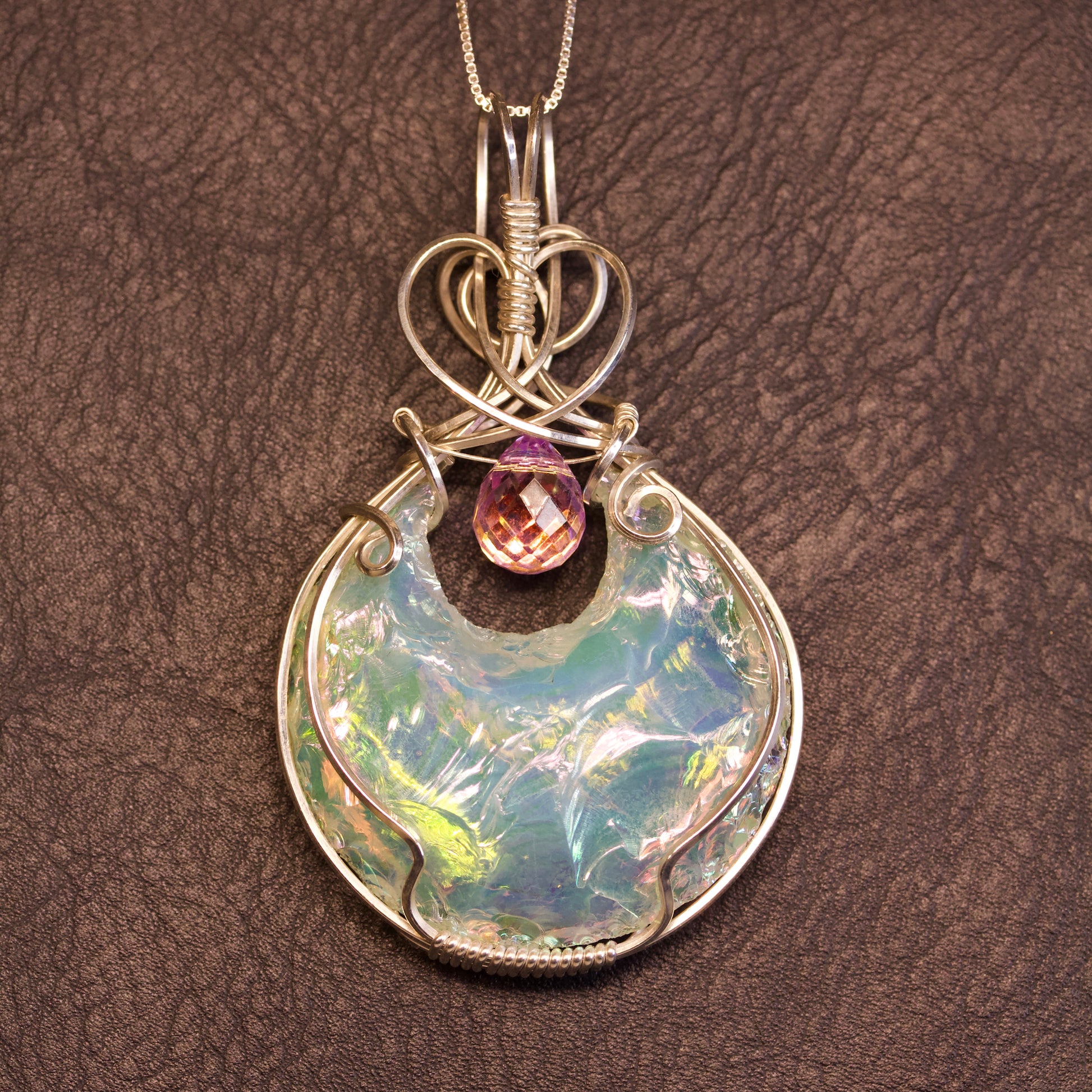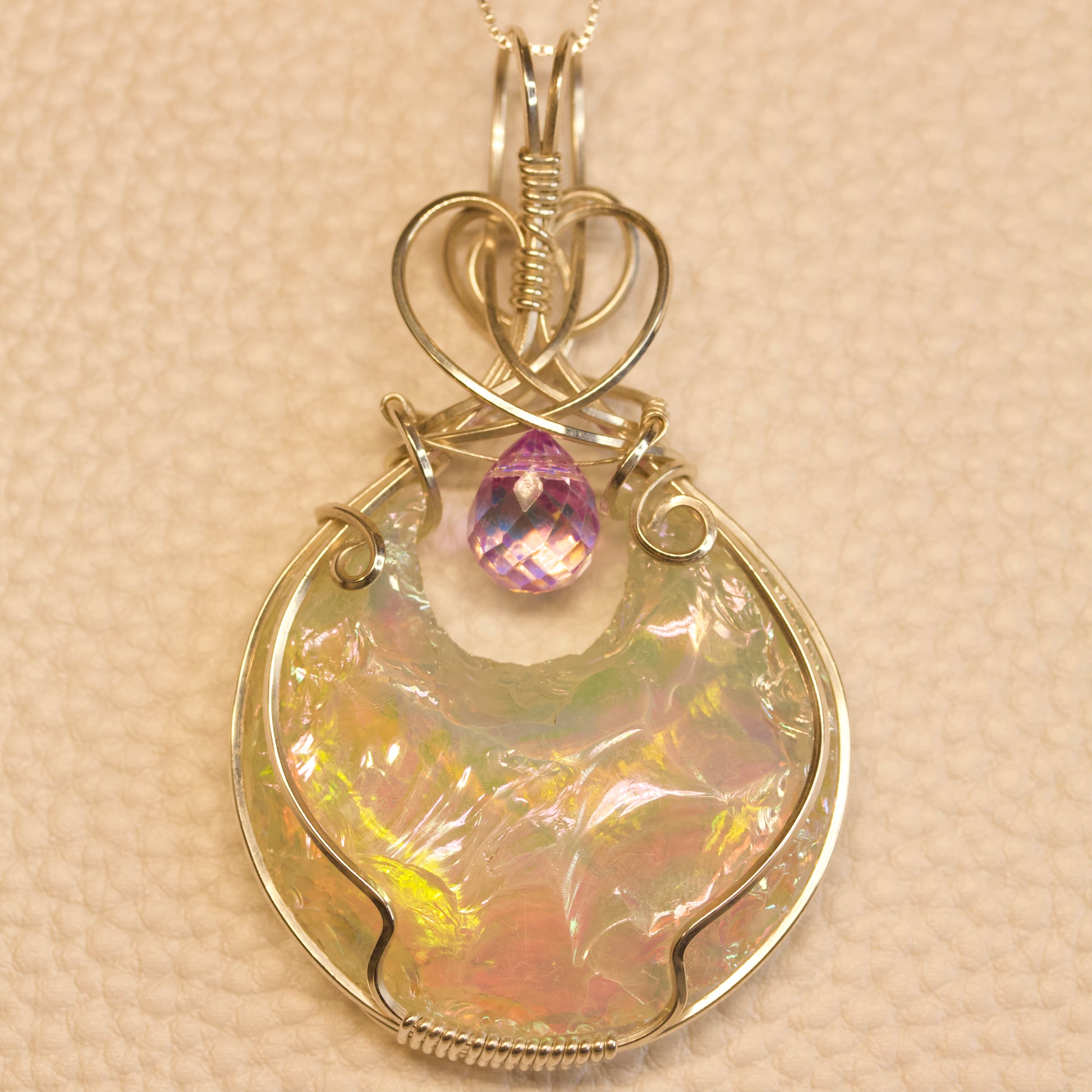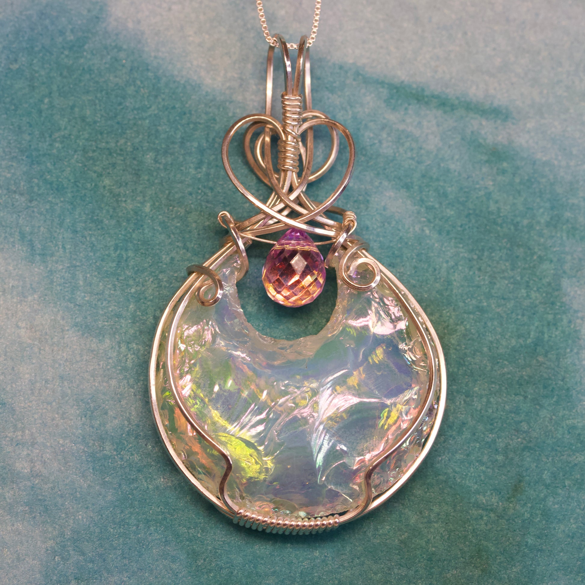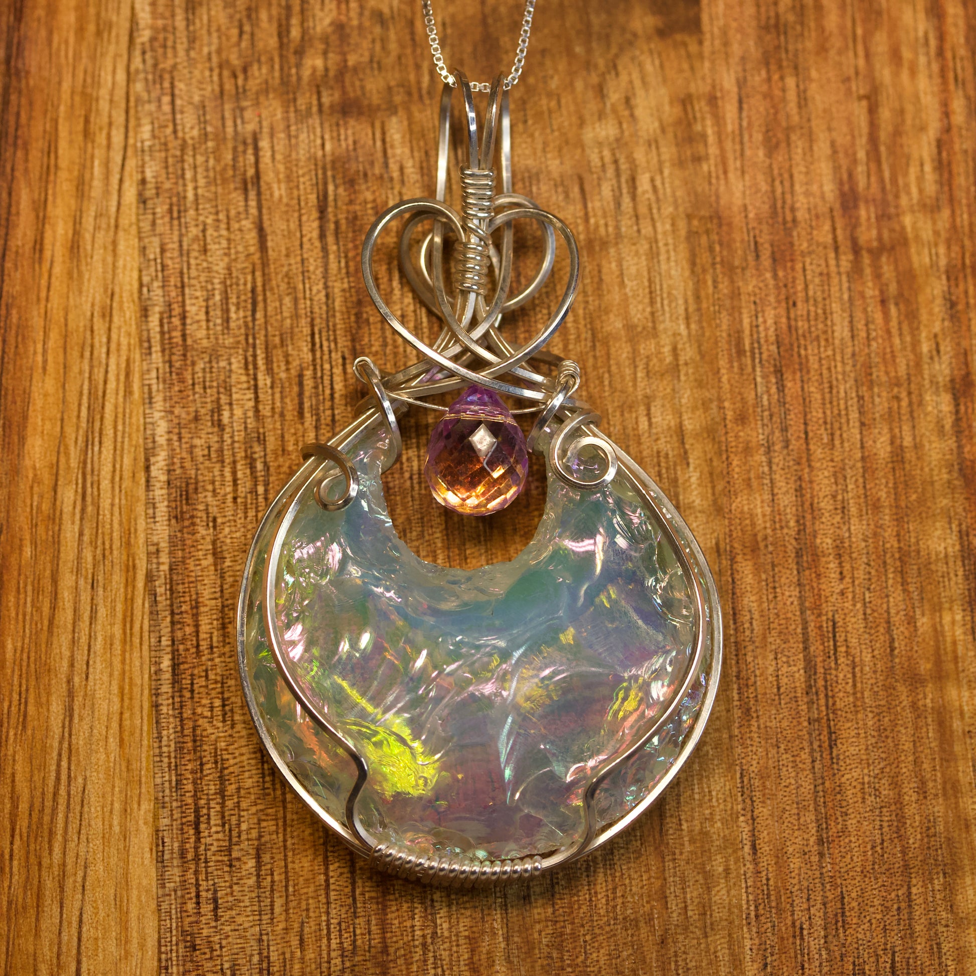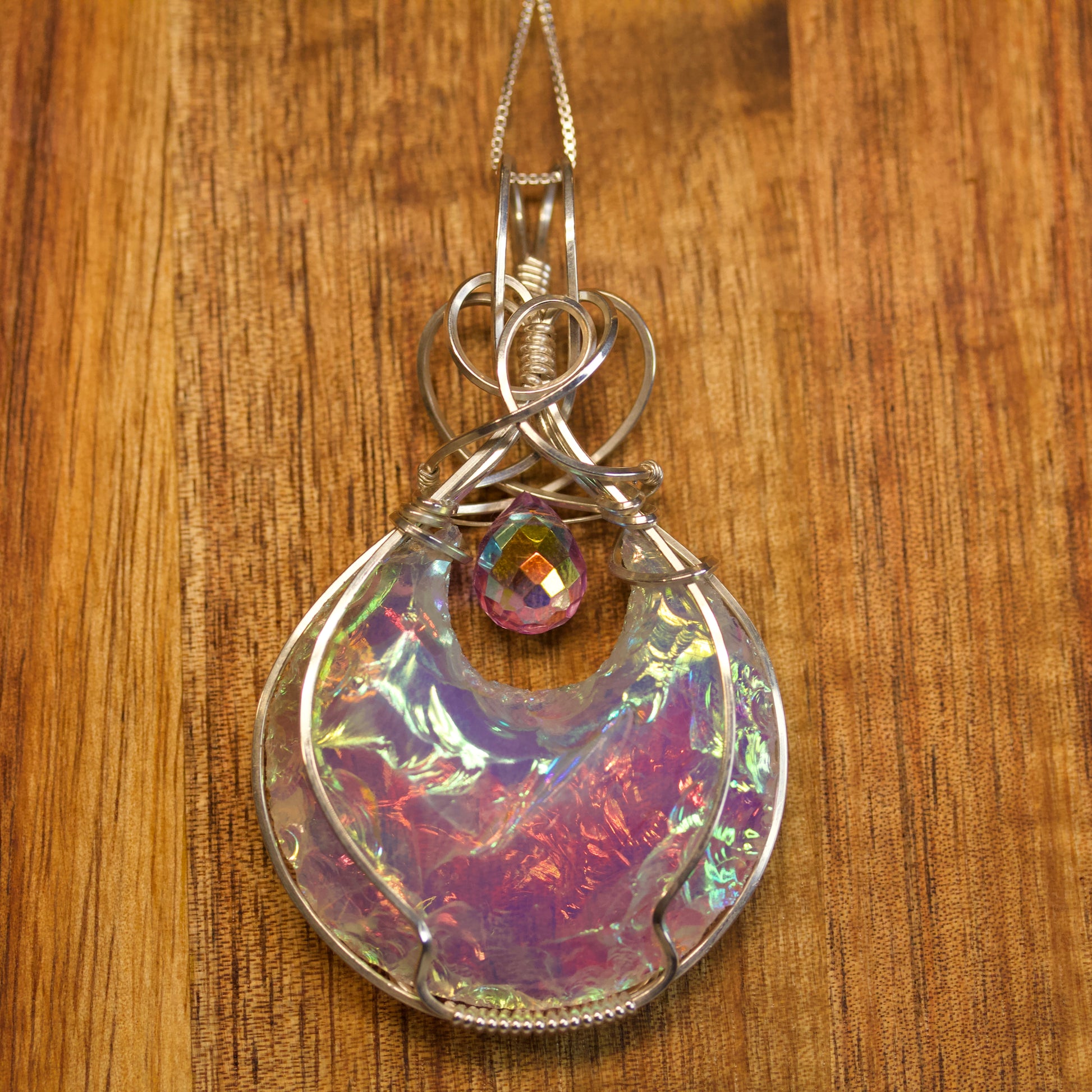 Unleash your inner mystic with our Reversible Aura Quartz Crescent Pendant! This unique, square sterling silver wire pendant features a mesmerizing aura quartz center stone and a glass accent bead. Unleash positive energy and style with this one-of-a-kind accessory.